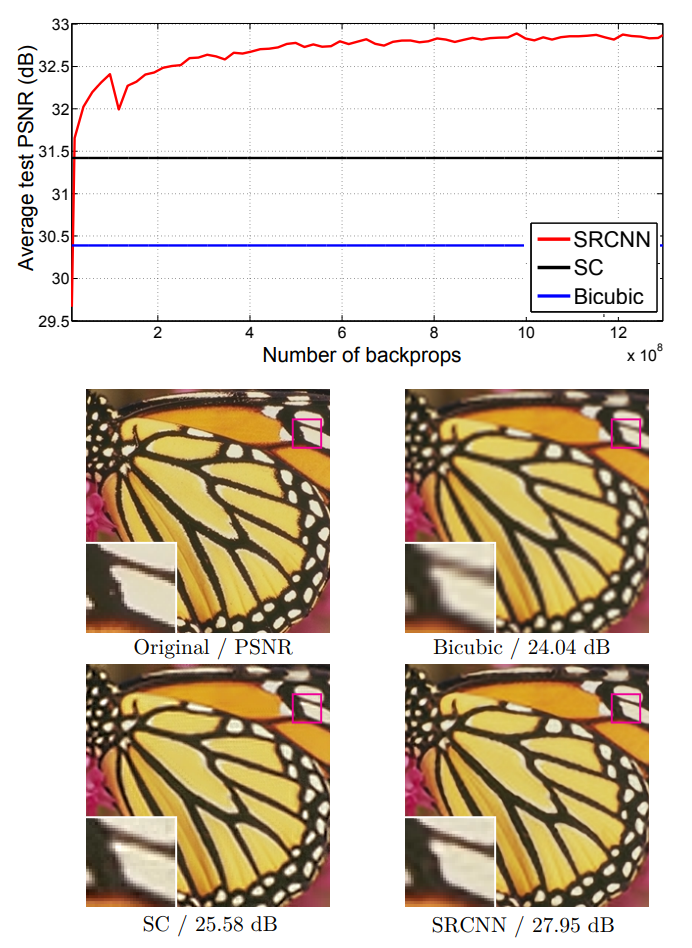 훈련 데이터는 91 images, ImageNet 두가지였는데, ImageNet에서 훈련한게 성능이 더 좋습니다. 즉, 위에서 언급한 SRCNN의 네가지 장점 중 하나인 "데이터셋이 더 다양할수록 성능이 증가한다"는 것이 증명됩니다. 위 그래프에서 이를 확인할 수 있습니다. 그리고 이 실험을 포함한 다른 실험에선 Set5를 검증 데이터셋으로 사용했고, Set14를 검증 데이터셋으로 사용해도 비슷한 경향을 보였다고 합니다.