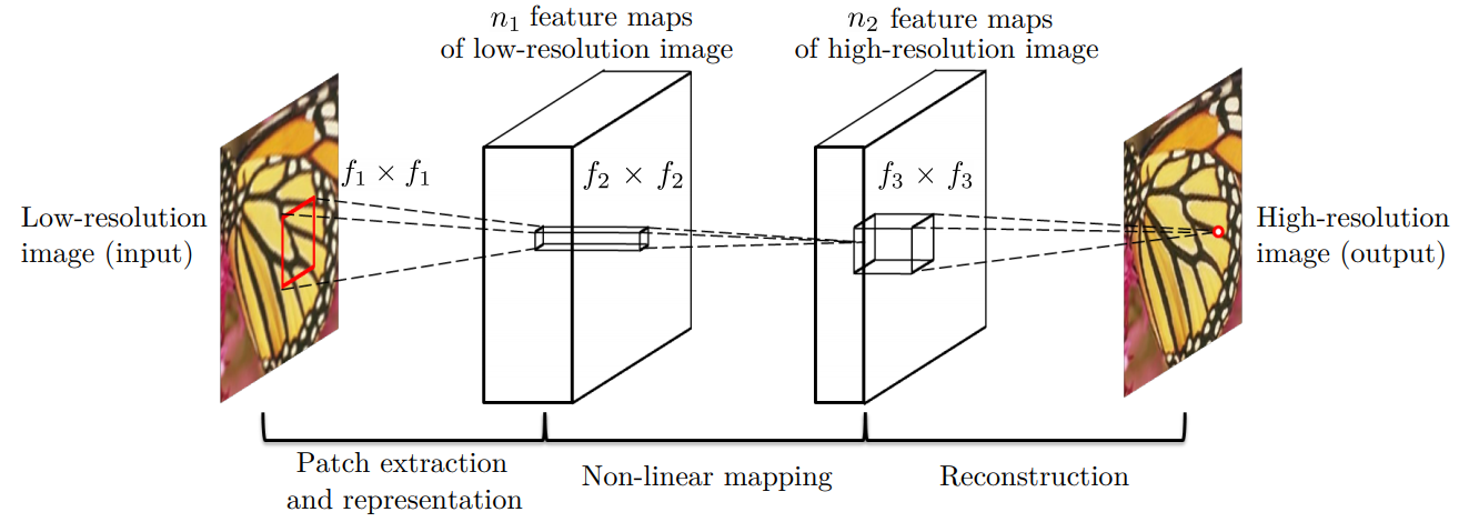 이 논문에선 저해상도 이미지와 고해상도 이미지를 처음부터 끝까지(end-to-end mapping) 통과시켜 학습하는 CNN을 생각했습니다. CNN을 이용한 SR은 기존의 방법들을 모두 아우를 수 있다고 합니다. 딕셔너리나 매니폴드를 사용하지 않고, 패치 추출이나 모음도 Conv 레이어를 통해 이루어질 수 있습니다. 이들은 이 CNN 모델을 Super-Resolution Convolutional Neural Network, 즉 SRCNN이라고 이름 붙입니다.